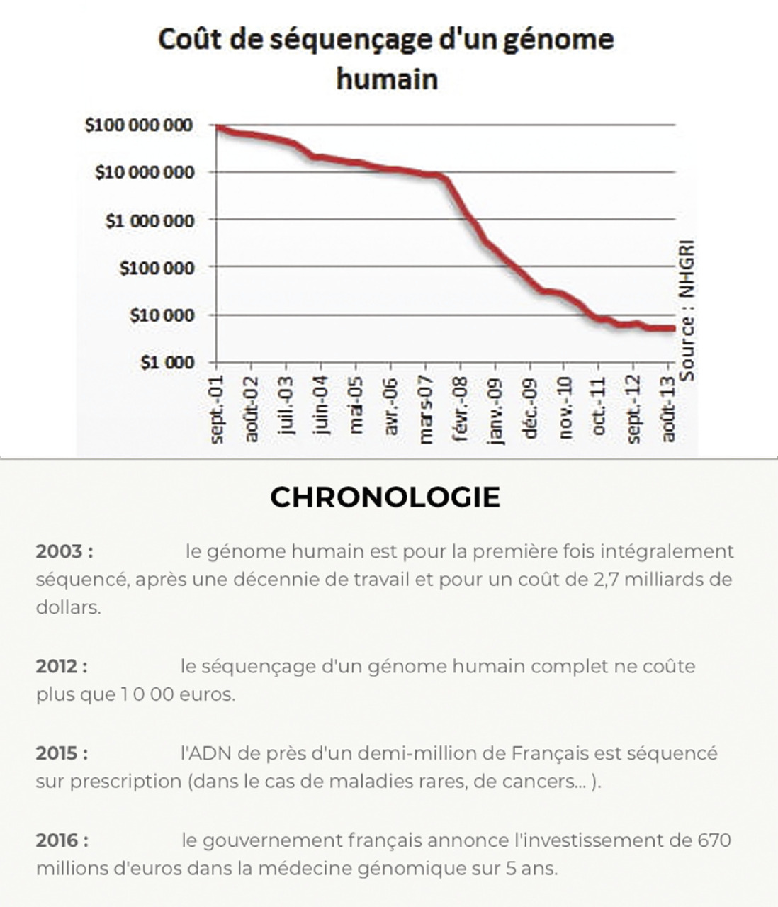 L’addition successive des quatre nucléotides A, G, C, T constituant un cycle qui est répété environ 200 fois permet de définir la séquence à analyser. La puissance de la méthode est de l’ordre de 100 000 séquences déterminées en parallèle. Bien qu’extrêmement puissante, elle n’en fut pas moins assez rapidement dépassée par plusieurs instruments dont en réalité un seul s’est finalement imposé, celui de Solexa racheté par Illumina, qui domina totalement le domaine. Par bien des côtés, la méthode développée par Solexa/Illumina ressemble à la méthode précédente en ce sens qu’après fabrication d’une librairie, celle-ci est déposée dans ce qu’Illumina appelle une « flow cell » dans laquelle chaque molécule d’ADN s’hybride par son extrémité 3’ (à laquelle lors de la constitution de la banque avait été ligaturé un oligonucléotide A) à un oligonucléotide complémentaire B greffé sur la « flow cell » par son extrémité 5’. Comme son nom le laisse penser, différents réactifs sont introduits par la machine dans la flow cell dans laquelle une amplification des molécules se fait, permettant d’obtenir des bouquets de chaque chaîne suivie de la détermination de leurs séquences à partir d’une amorce par ajout séquentiel comme dans la méthode précédente des quatre bases A,G,C,T, chacune porteuse d’un fluorophore différent permettant leur identification. La puissance des derniers séquenceurs Illumina est telle qu’en deux jours la machine est en mesure de déterminer jusqu’à 330 Gb, soit l’équivalent de 100 génomes humains, d’un échantillon unique ou de plusieurs déposés en même temps dans la flow cell et dont le nombre n’est limité que par la profondeur du séquençage que l’on souhaite pour chacun d’eux.22 La puissance d’analyse de ces machines entraîna une baisse très importante des coûts (fig. 3 ).