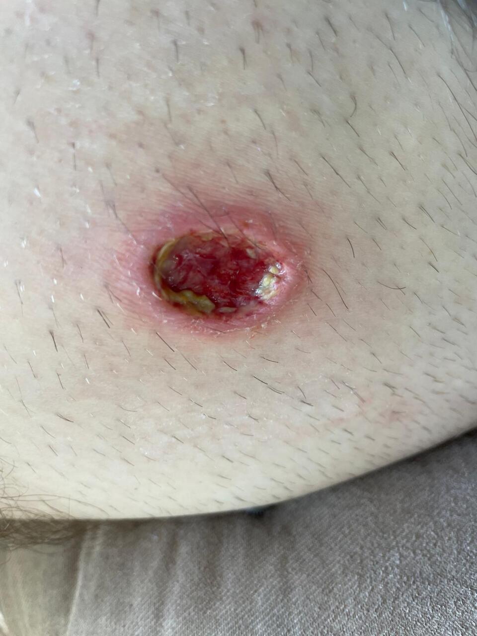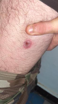 Mathéo, un militaire de 23 ans, est déployé en Guyane française sur le camp de Maripasoula. Il s’agit de son premier déploiement et il est revenu récemment de sa première mission dans la jungle. Depuis cette sortie, il note une lésion de piqûre de moustique sur la cuisse qui ne guérit pas. Après nettoyage, la plaie apparaît peu profonde, indolore, avec des bords surélevés légèrement inflammatoires et d’aspect ulcéré (fig. 1). Le diagnostic de leishmaniose cutanée est suspecté. Pour le confirmer, les méthodes disponibles à l’antenne médicale de Cayenne sont le frottis et l’écouvillonnage, permettant d’obtenir la confirmation diagnostique mais surtout la confirmation de l’espèce en trois à six semaines. Il s’agissait de Leishmania guyanensis. Une antibiothérapie a été prescrite (iséthionate de pentamidine à la dose de 4 mg/kg, par voie intraveineuse lente, en trois injections un jour sur deux), ainsi que des soins locaux poursuivis les jours suivants, avec une nette amélioration (fig. 2).