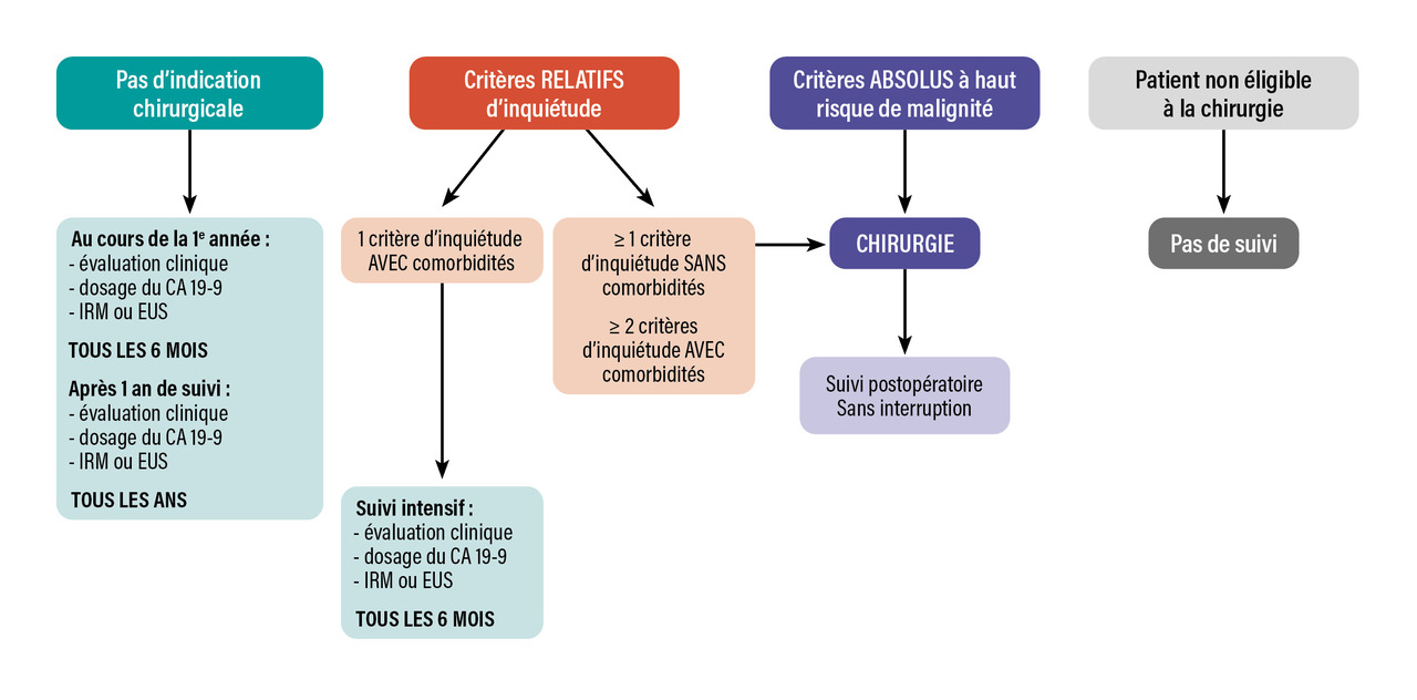 En cas de comorbidités importantes et/ou si les lésions pancréatiques ne sont pas opérables, on peut surseoir à une surveillance.