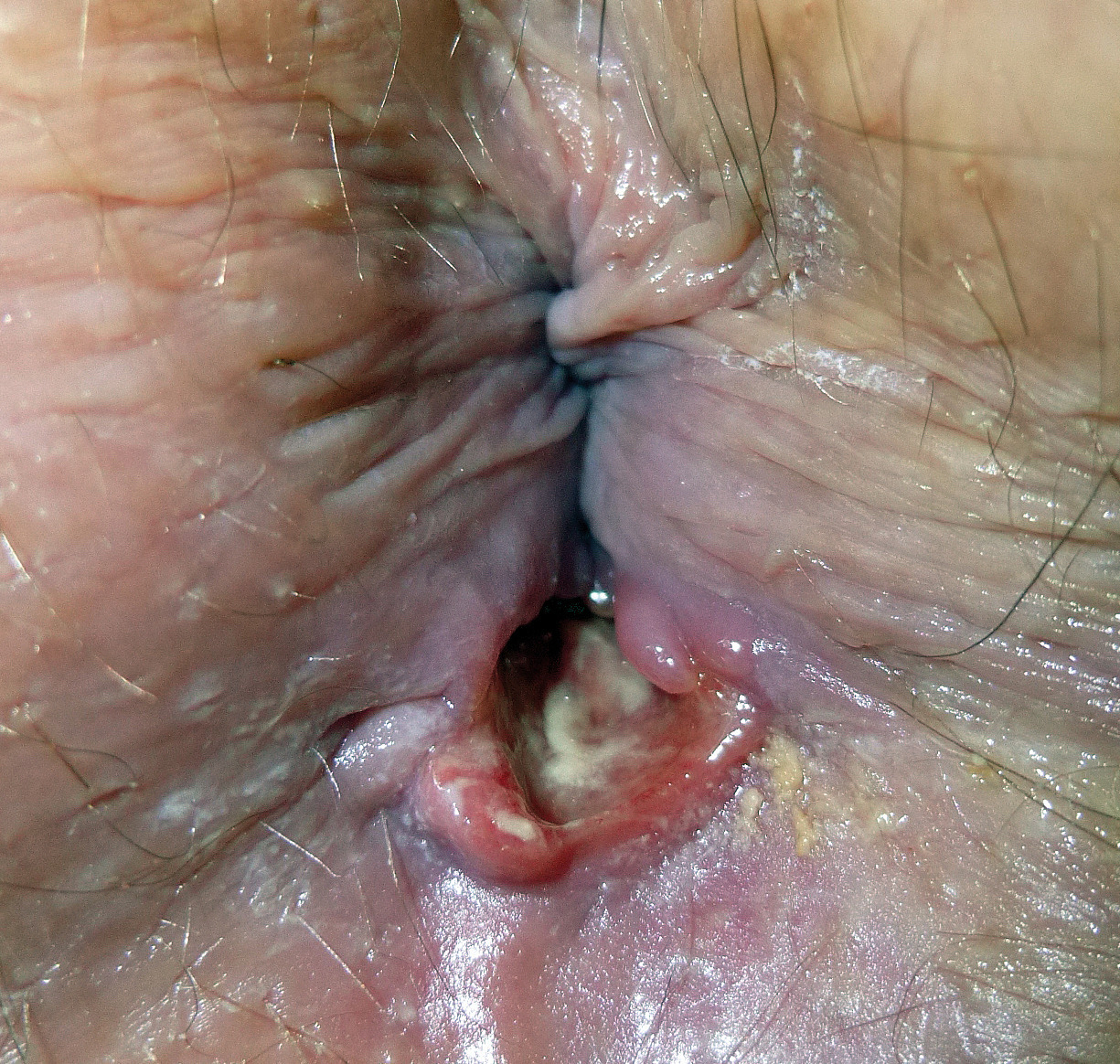 Un homme de 57 ans consulte pour des douleurs anales déclenchées par la défécation. L’examen clinique montre une ulcération de la marge (fig. 1).