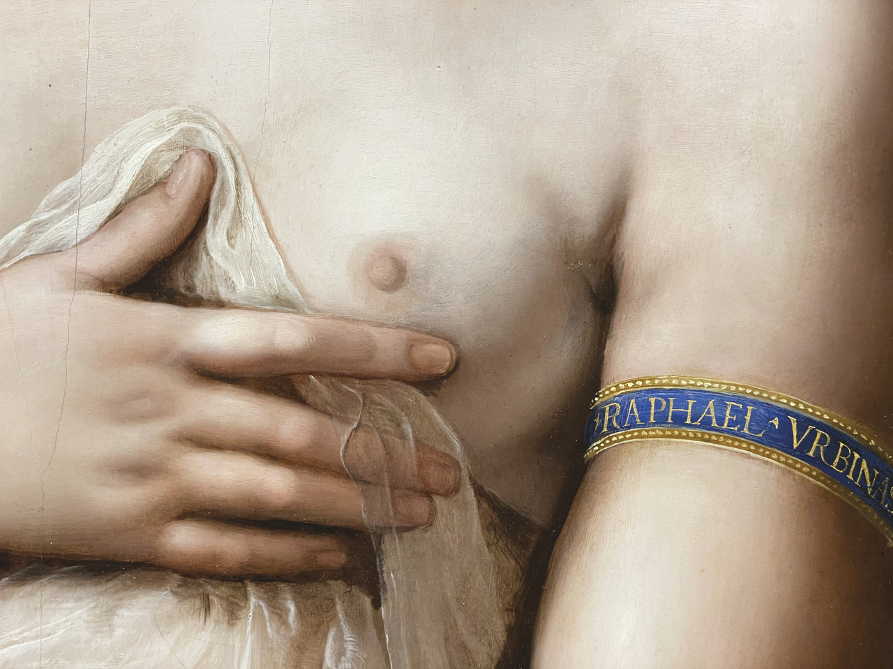 Maître livre de l’iconodiagnostic, Les Maladies dans l’art antique, co-rédigé par Mirko D. Grmek et Danielle Gourevitch (École pratique des hautes études, IVe section), reste un ouvrage fondamental pour l’iconodiagnostic,3 posant les bases de la reconstitution globale d’une pathocénose (c’est-à-dire l’histoire naturelle de l’équilibre homme-environnement-maladie, concept comparable aux notions de one health ou global health).4 Au décours de ce classique d’histoire de la médecine, les exemples de la littérature biomédicale sont désormais nombreux, à commencer par le célèbre portrait de La Fornarina, œuvre délicate de son amant, le peintre Raphaël (fig. 1). Dans cette toile figurant la jeune femme torse nu, on note très clairement une voussure bleuâtre au niveau du sein gauche, soulevé par une main relativement pudique, et une rétractation cutanée au niveau de l’aisselle ; en outre, même en intégrant les déformations induites par la perspective, il existe une asymétrie entre les membres supérieurs, avec ce qui a été interprété comme un œdème brachial gauche (fig. 2). L’ensemble, quand on croise les données de l’histoire de l’art et de l’iconodiagnostic, correspond très certainement à la représentation bien involontaire, par Raphaël, du cancer du sein avec envahissement axillaire de sa maîtresse,5 qui succomba peu après être entrée dans les ordres, à la mort du peintre l’année suivante (1520).