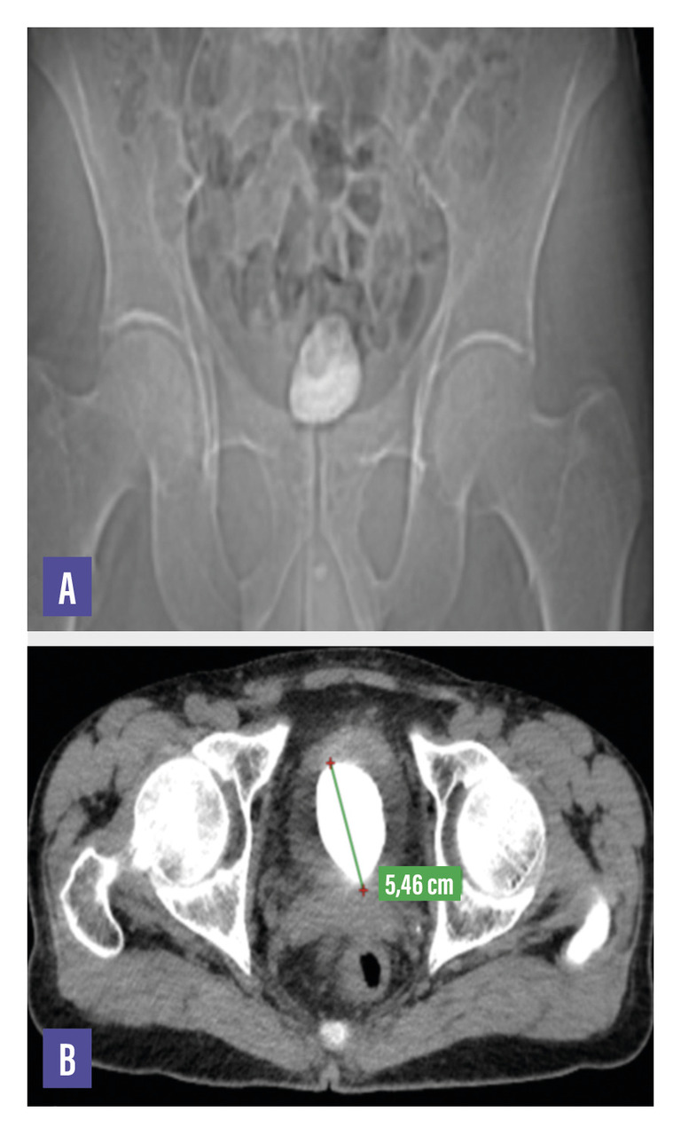 Une radiographie de l’abdomen sans préparation centrée sur le bassin montre une opacité de tonalité calcique occupant l’aire vésicale (fig. A). Un scanner abdomino-pelvien sans injection de produit de contraste est réalisé afin de mieux analyser cette masse ; il permet de visualiser une lithiase vésicale occupant la quasi-totalité de la vessie et mesurant 55 × 45 mm avec 1 120 UH de densité (fig. B).