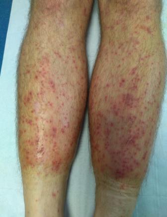 Un militaire d’une vingtaine d’années consulte pour une éruption au niveau des membres et du pli interfessier évoluant depuis une quinzaine de jours. Il revient d’un séjour de deux semaines dans la forêt tropicale, en Guyane française ; l’hygiène de vie y était dégradée (douche dans la crique) et il a effectué des marches quotidiennes durant cette mission.