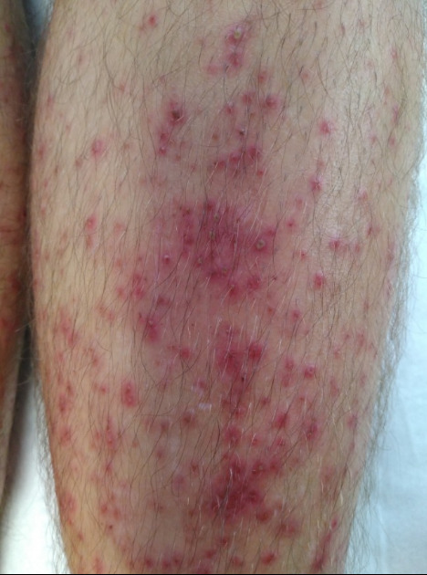 Les lésions sont érythémateuses, papuleuses, prurigineuses avec un début de surinfection (fig. 1 et 2).