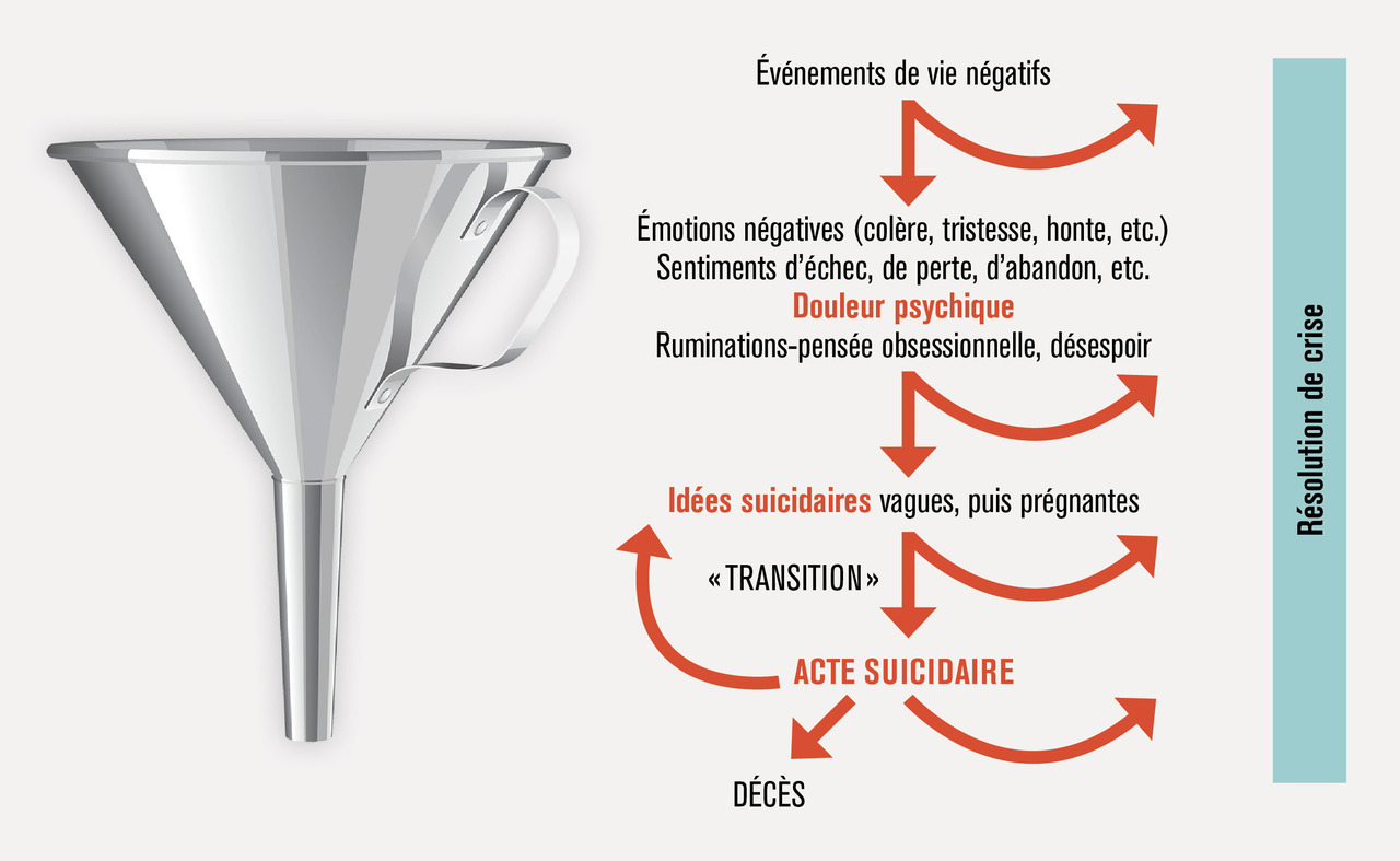 La crise suicidaire a été modélisée comme un entonnoir qui conduit à une pensée de plus en plus « tunnelisée et constrictive », le sujet ayant le sentiment croissant que l’acte suicidaire est l’unique solution à ses problèmes. Comme le décrit le romancier Alfredo Alvarez dans Le Dieu sauvage (1972) : « Une fois qu’un homme décide de prendre sa propre vie, il entre dans un monde en arrêt, inexpugnable, mais totalement convaincant où tous les détails s’adaptent et chaque incident renforce sa décision. » L’aliéniste Jean-Étienne Esquirol au XIXe siècle parle de « monomanie suicidaire ».