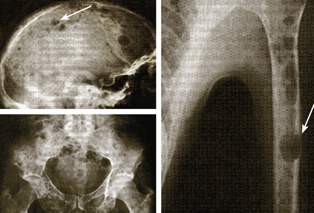 Les clichés standard du squelette axial (crâne, rachis, côtes et bassin) restent encore la référence pour diag­nostiquer une atteinte osseuse mais devraient être remplacés, en raison de leur faible sensibilité, par l’imagerie moderne. Les anomalies évocatrices sont une lyse à l’emporte-pièce (géode ou lacune), visible sur les os plats, associée ou non à une déminéralisation diffuse, ou sur les os longs avec résorption corticale et menace de fracture pathologique (fig. 4). Les lacunes peuvent être totalement asymptomatiques, notamment lorsqu’elles siègent sur le crâne. Les tassements vertébraux, plus ou moins complets, voire en galette, sont toujours symptomatiques. Le scanner du corps entier faible dose devrait remplacer les clichés standard en raison de sa plus grande sensibilité, de sa durée de réalisation plus courte et de sa plus faible dose délivrée d’irradiation. L’IRM du corps entier et le TEP-scan détectent 20 % de lésions supplémentaires par rapport aux clichés osseux standard sous la forme d’images nodulaires en hyposignal T1 et hypersignal T2 et STIR, pour l’IRM (fig. 5), ou de foyers hypermétaboliques correspondant aux lacunes sur le scanner, pour le TEP-scan (fig. 6). Ces examens sont particulièrement utiles dans les formes peu avancées de la maladie (absence d’anomalie sur les clichés standard), pour dépister une épidurite ou confirmer le caractère tumoral du tassement vertébral (IRM) et pour suivre l’évolution sous traitement (réponse métabolique au TEP-scan avec disparition des foyers hypermétaboliques). Leur utilisation est en cours de validation et limitée par leur accessibilité.