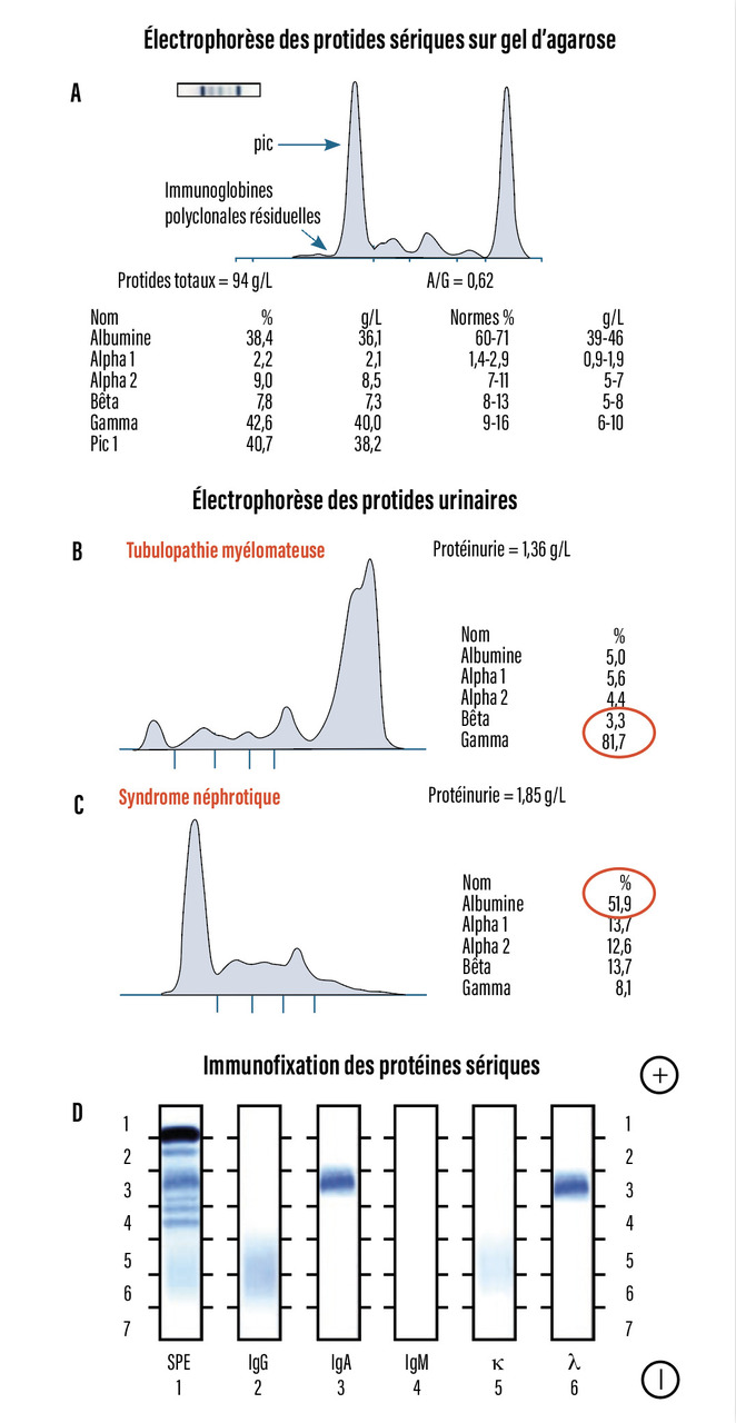 L’immunoglobuline monoclonale est suspectée sur la présence d’une bande étroite migrant dans les gammaglobulines ou, moins souvent, dans la région des bêtaglobulines, sur l’électrophorèse des protides sériques (EPS) ou urinaires (EPU) (fig. 2A). L’électrophorèse des protides sériques ou urinaires permet, par intégration du pic (aire sous la courbe), d’estimer la quantité d’immunoglobuline monoclonale. Seules l’immunofixation (IF) ou l’immuno-électrophorèse (IEP) permettent d’identifier l’immunoglobuline monoclonale en déterminant sa chaîne lourde (IgG dans 60 % des cas ou IgA dans 20 % des cas) et sa chaîne légère (kappa ou lambda) [fig. 2B]. Parfois, l’électrophorèse des protides sériques ne montre pas de pic mais une hypogammaglobulinémie (15 à 20 % des myélomes) : il faut alors savoir rechercher la présence de chaînes légères isolées kappa (deux tiers des cas) ou lambda (un tiers des cas), dans le sang ou dans les urines, par immunofixation ou immuno-électrophorèse. La présence de chaînes légères dans les urines correspond à ce que l’on nommait protéinurie de Bence-Jones, détectée par des méthodes de précipitation à chaud à l’acide sulfosalicylique. Dans moins de 1 % des cas, aucune immunoglobuline monoclonale n’est détectée : il s’agit d’un myélome non sécrétant ou non excrétant. Le diagnostic est évoqué devant une hypogammaglobulinémie à l’électrophorèse des protides sériques et confirmé par la plasmocytose médullaire associée à un critère CRAB (v. infra).