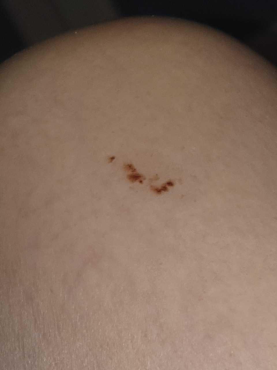 Inès, 53 ans, a constaté que la « tache de naissance » de l’une de ses cuisses (figure) avait évolué. La lésion était auparavant composée de papules pigmentées polychromiques sur un fond très discrètement hyperpigmenté. La base s’est éclaircie et les lésions centrales ont foncé.