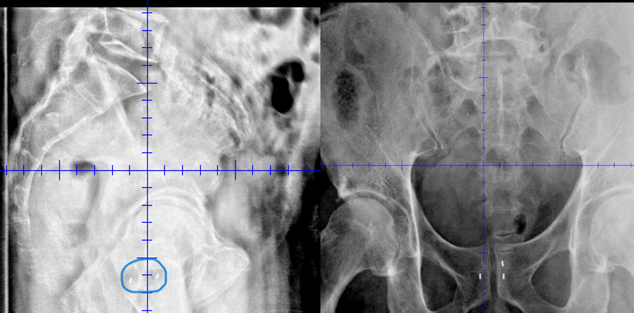 Il est également possible d’effectuer, avant la radiothérapie, une mise en place de fiduciaires, ou grains d’or, se figeant de manière définitive dans la prostate, et d’appréhender les mouvements de cette dernière pendant les traitements par un suivi de ces grains d’or, soit avant chaque séance, soit pendant la séance en direct (figure).
