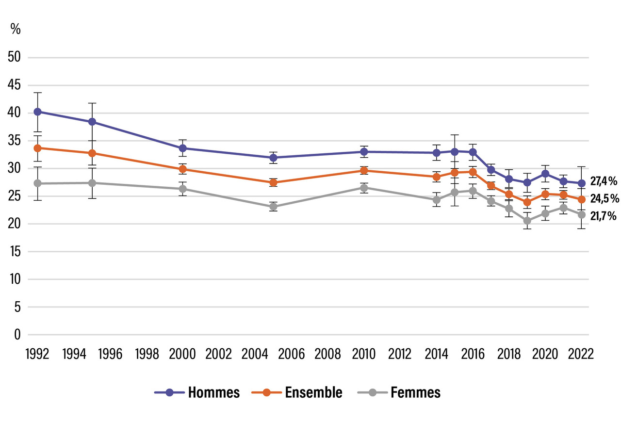 Entre 2000 et 2016, la consommation quotidienne de tabac en population adulte est restée relativement stable, autour de 30 %. Puis, entre 2016 et 2019, une baisse d’ampleur inédite depuis le début des années 2000 a été observée, jusqu’à atteindre une prévalence du tabagisme quotidien de 24 %. Entre 2019 et 2022, celle-ci s’est stabilisée (fig. 1).