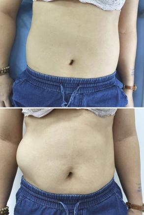 La pression du point de Mac Burney déclenche une douleur élective. L’examen en position debout fait apparaître une déhiscence de 10 à 15 cm de diamètre localisée au flanc droit (figure ). Les réflexes abdominaux sont absents du côté droit. L’examen cutané montre une lésion papuleuse et érythémateuse évocatrice de zona dans la région lombaire droite.