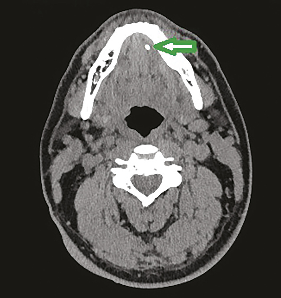 Le scanner peut être réalisé sans injection de produit de contraste dans la majorité des cas (l’injection de produit de contraste peut s’avérer utile en cas d’atteinte inflammatoire de la glande ou de recherche d’abcès). Il a une sensibilité de 100 % et une spécificité de 75 %. Il permet au chirurgien une bonne localisation de la lithiase et est un examen relativement facile à obtenir (fig. 1 ).6 Il comporte cependant quelques inconvénients : il s’agit d’un examen irradiant, et il peut être difficilement interprétable en cas d’artéfacts dentaires.