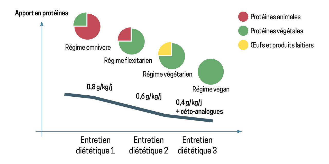 - 0,28 à 0,43 g de protéines/kg/j avec supplément par des céto-analogues ;