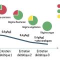 Il n’est pas facile de modifier des habitudes diététiques, et les patients atteints de MRC peuvent rencontrer des difficultés à opérer ces changements. Le soutien diététique est primordial dans les trois à six mois d’installation. L’éducation thérapeutique des patients comporte un volet nutritionnel : c’est une phase clé qui permet la réussite du programme diététique. Le diététicien doit veiller à sélectionner le niveau de réduction le plus adapté au patient et à son entourage, ainsi qu’en matière de produits à cuisiner, goût, répartition des aliments durant la journée et durant la semaine. Il est conseillé d’effectuer une réduction progressive sur plusieurs mois, avec des paliers à 0,8 puis 0,6 puis éventuellement 0,3 g de protéines/kg/j (fig. 3). Le patient qui y adhère baisse progressivement ses apports en protéines, apprend à les identifier en faisant ses courses, les choisit végétariennes. Il réduit également sa consommation en sel et en phosphates. La baisse de l’urée sanguine, rapidement observée, soutient alors ses efforts au quotidien.