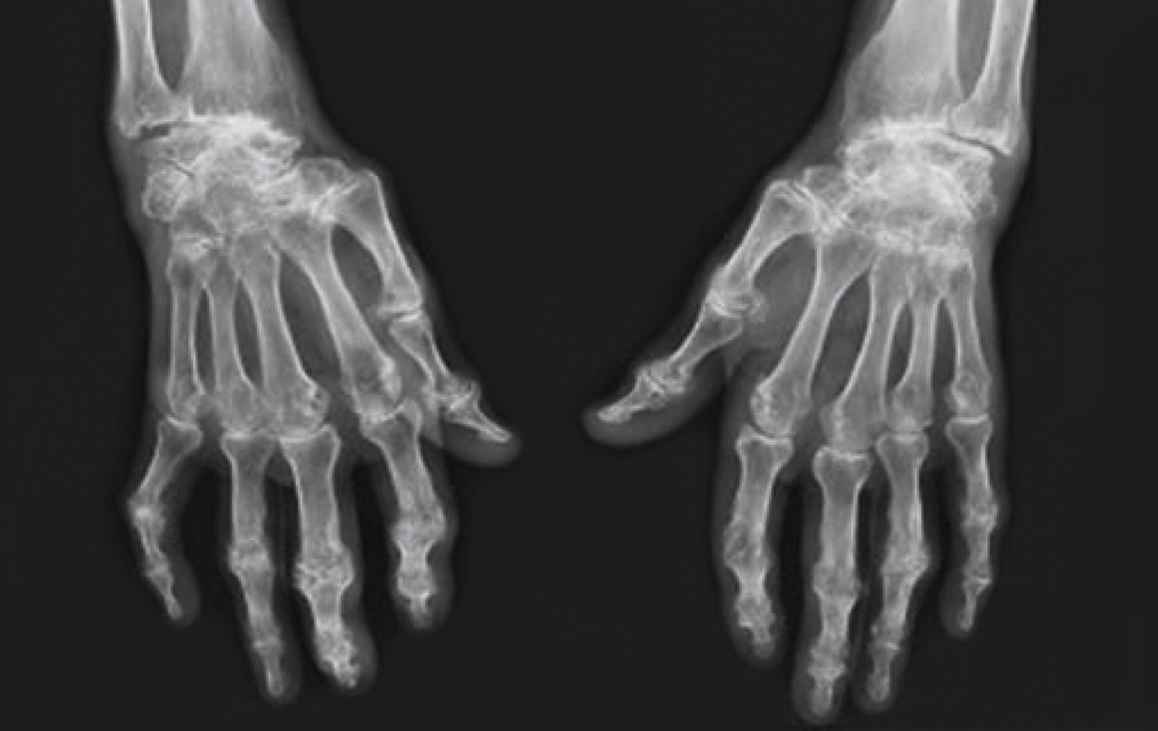 Le bilan initial systématique comporte des radiographies standard à 100 % des mains et des poignets de face sur la même plaque, des avant-pieds de face et de trois quarts. En fonction de l’atteinte, d’autres clichés centrés peuvent être réalisés. Ces examens peuvent aider au diagnostic et servent, dans tous les cas, de référence pour le suivi du patient. Il peut être mis en évidence une classique déminéralisation en bandes, non spécifique. Exceptionnellement, on observe une ou plusieurs érosions radiographiques précoces très fortement évocatrices du diagnostic de polyarthrite rhumatoïde ou bien un pincement articulaire diffus, et enfin des géodes. Le plus souvent, les modifications radiographiques surviennent secondairement, favorisées par la chronicité des synovites.