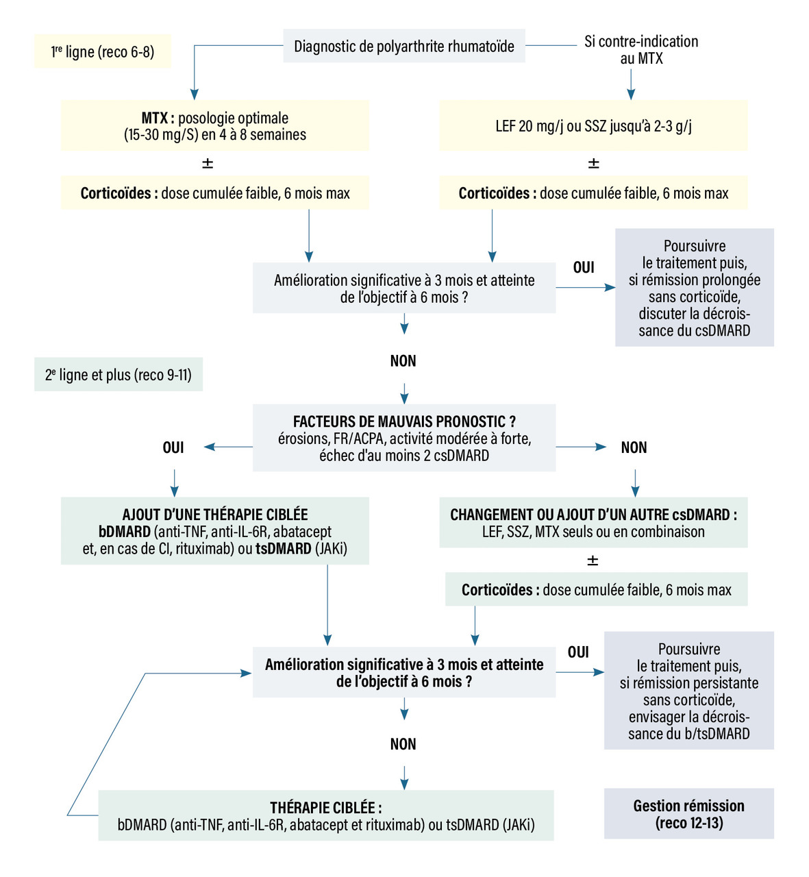 D’après les recommandations de la Société française de rhumatologie pour la prise en charge de la polyarthrite rhumatoïde (2019), l’objectif du traitement est d’atteindre et de maintenir la rémission clinique ou, au minimum, la faible activité pour chaque patient, afin de prévenir la progression structurale et le handicap. La stratégie thérapeutique recommandée pour atteindre cet objectif est résumée dans la fig. 4. Ces recommandations montrent la place centrale qu’occupe toujours le méthotrexate dans l’arsenal thérapeutique de la polyarthrite rhumatoïde.