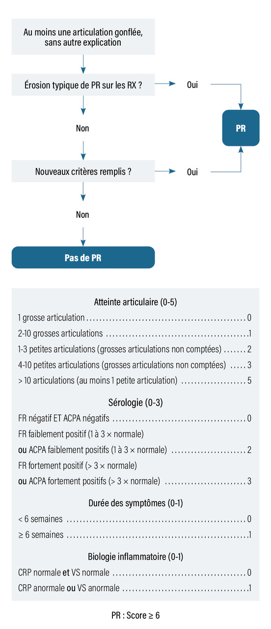Les critères de classification ACR-EULAR 2010 ont été élaborés dans le but d’aider au diagnostic de polyarthrite rhumatoïde débutante. Ils sont récapitulés, à titre indicatif, dans la fig. 1.
