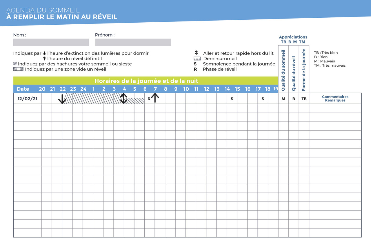Cette deuxième consultation permet l’analyse de l’agenda du sommeil et l‘évaluation sur une dizaine de nuits de :