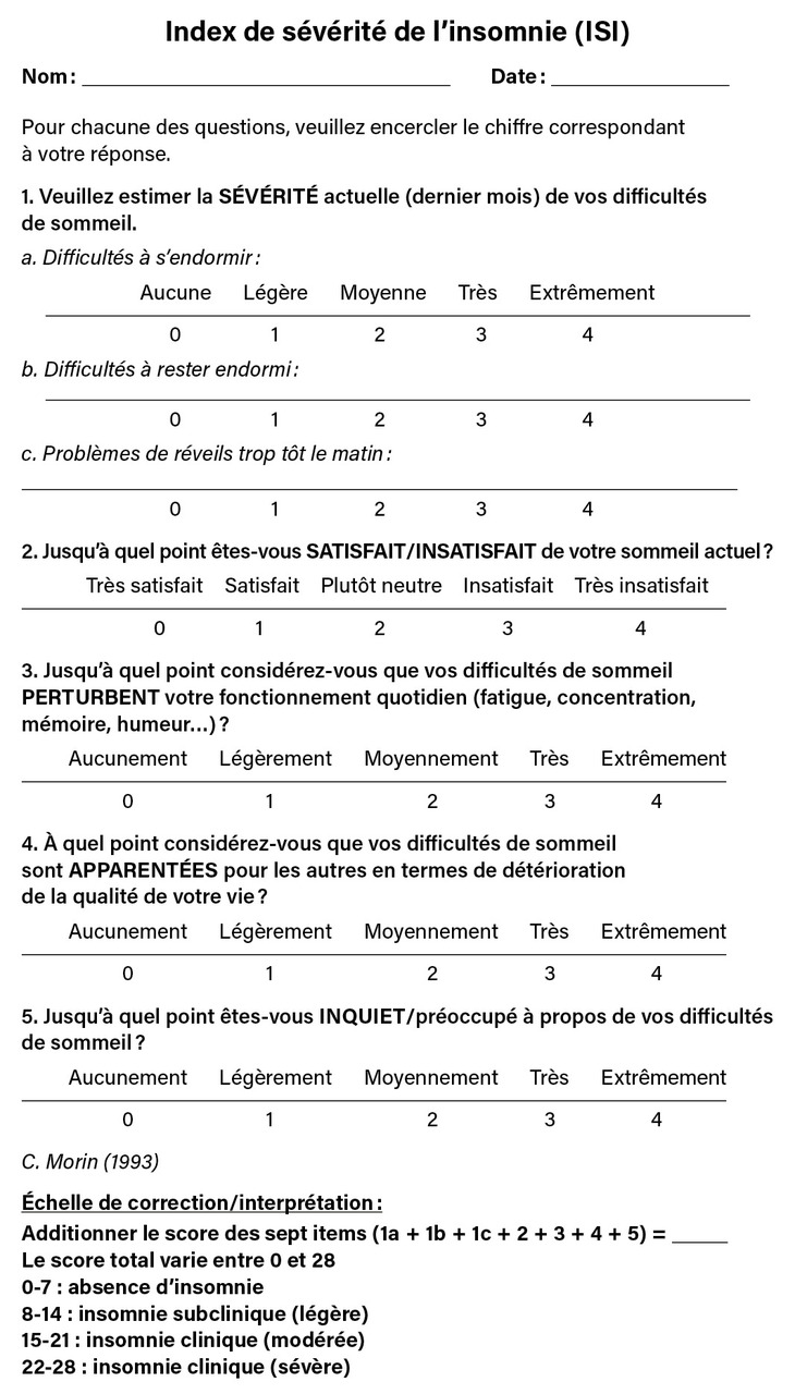 1. Index de sévérité de l’insomnie (ISI). Institut national du sommeil et de la vigilance. https://vu.fr/UScvj