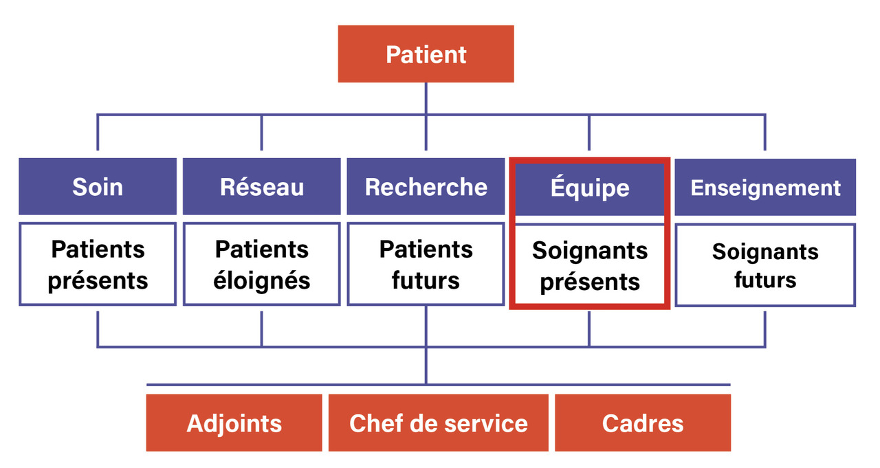 Dans notre système de soins, le service a depuis longtemps une structure pyramidale, au sommet de laquelle se trouve le chef de service, invité à gouverner de façon verticale et descendante. Ce dernier a rarement été sélectionné pour ses qualités managériales et n’a le plus souvent pas reçu de formation pour cela. Il en résulte parfois des tensions dans la gestion des équipes.