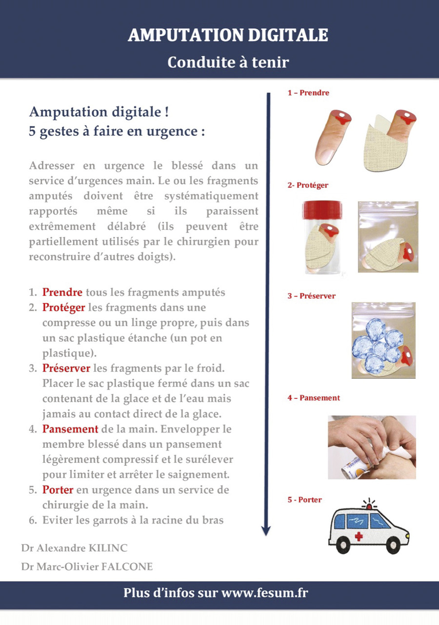 L’amputation est l’accident le plus grave, il est donc important de conserver l’ensemble des fragments pour que le chirurgien puisse explorer et voir s’il est possible d’envisager une réimplantation (fiche sur la conduite à tenir en cas d’amputation en