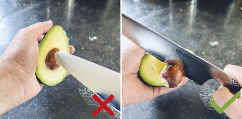 - adopter la bonne technique de dénoyautage d’avocat (avec une cuillère ou le plat d’un couteau) [