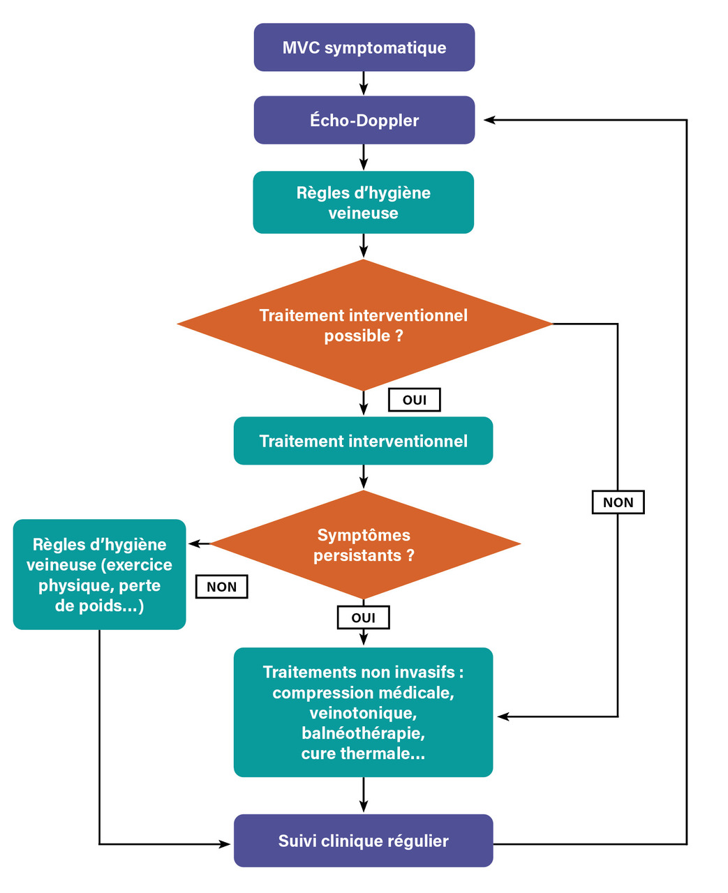 La prise en charge de la MVC est différente en fonction de la sévérité de la maladie. Une combinaison de règles hygiénodiététiques, traitements médicaux (compression veineuse, veinotonique…) et interventionnels est souvent nécessaire pour améliorer la qualité de vie des patients. Malgré les progrès thérapeutiques, un suivi à long terme reste essentiel pour surveiller la progression de cette maladie chronique et adapter le traitement en conséquence (fig. 2 ).