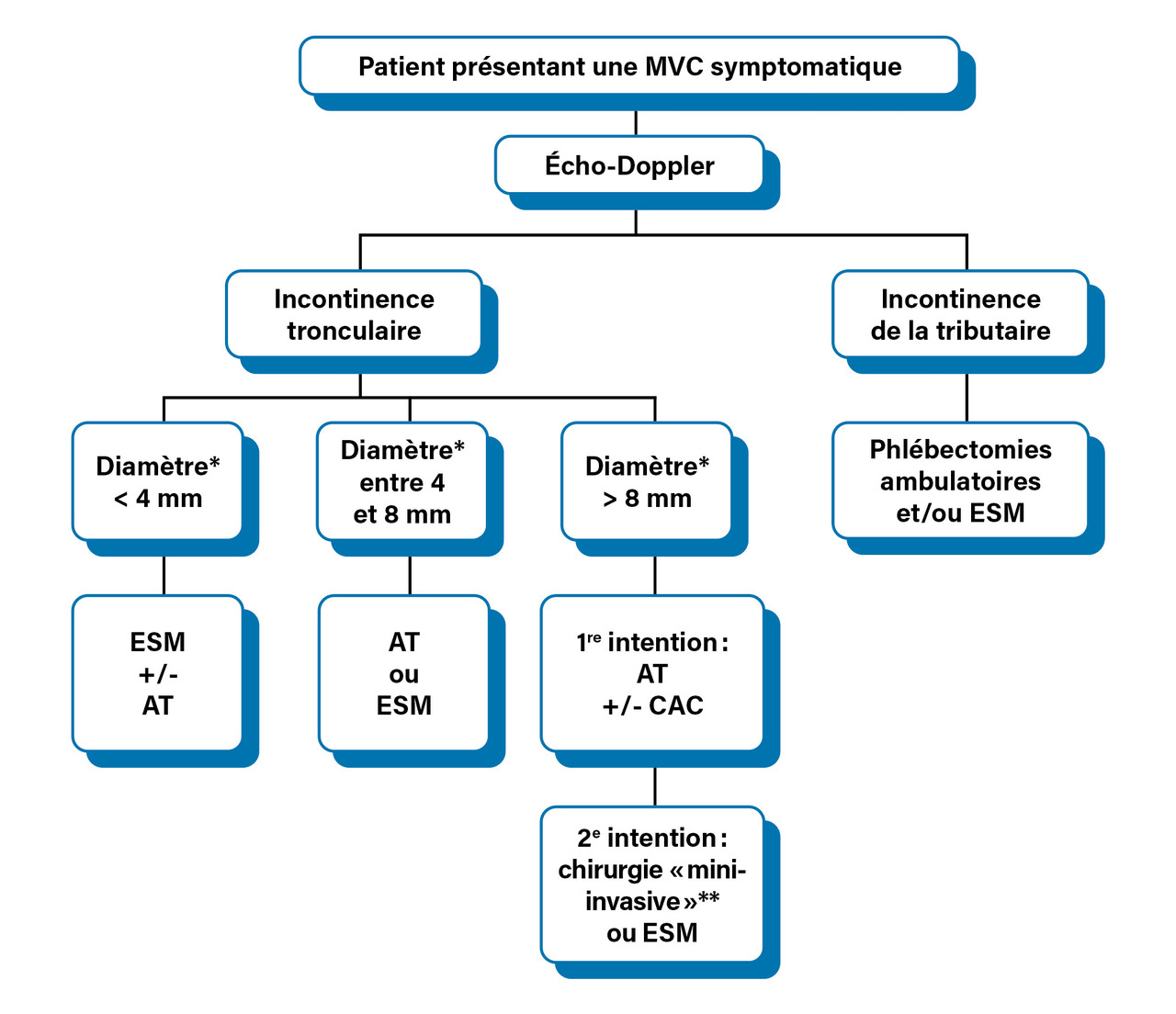 Chez les patients ayant une MVC avec une incompétence des veines superficielles (c’est-à-dire avec un reflux supérieur à 0,5 seconde à l’écho-Doppler), la stratégie de prise en charge dépend principalement de la présentation clinique (antécédents, symptômes) et des données anatomiques et hémodynamiques détaillées de l’écho-Doppler.9