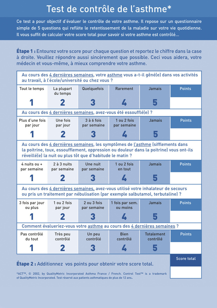 Une fois le traitement débuté, les ajustements de palier dépendent du contrôle de l’asthme, qui doit être évalué de manière objective. Pour cela, l’utilisation des questionnaires ACT (test de contrôle de l’asthme) avec cinq questions portant sur les symptômes des quatre dernières semaines (fig. 1) et ACQ (Asthma control questionnaire) avec six questions portant sur les symptômes des sept derniers jours (fig. 2) est recommandée. L’asthme est dit contrôlé si le score est supérieur à 20/25 pour l’ACT et supérieur à 1,5 pour l’ACQ. Le recours à ces outils est essentiel car la perception subjective du médecin est souvent incorrecte et différente de celle du patient.2,3 Les patients doivent être réévalués entre un et trois mois après l’introduction du traitement, puis tous les trois à douze mois selon l’évolution.