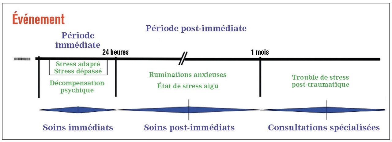 La présence de symptômes post-traumatiques spécifiques durant le premier mois est définie par le diagnostic d’état de stress aigu dans les classifications. Mais cette distinction théorique n’est-elle pas déjà la première phase d’un syndrome unique qui peut évoluer vers un trouble de stress post-traumatique ? Classiquement, un état de stress aigu implique de fait une orientation vers une prise en charge spécialisée.Les recommandations internationales préconisent en première intention une prise en charge psychologique spécifique et ciblée sur l’événement (