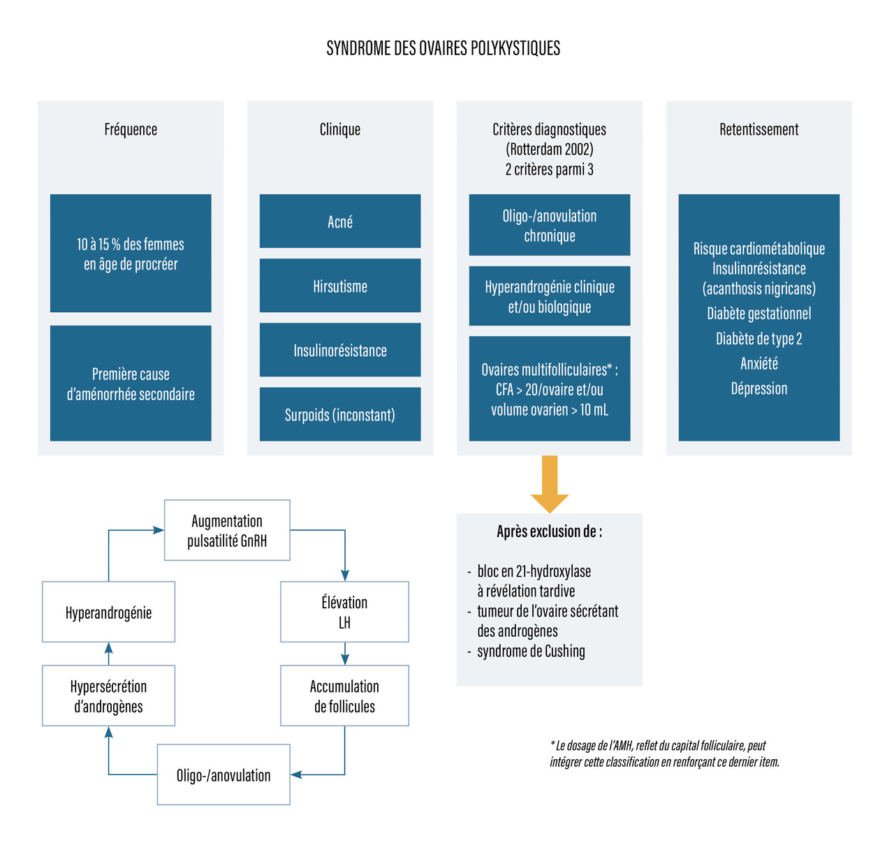 AMH : hormone antimüllérienne ; CFA : comptage des follicules antraux ; GnRH : gonadotropin-releasing hormone ; LH ; hormone lutéinisante.
