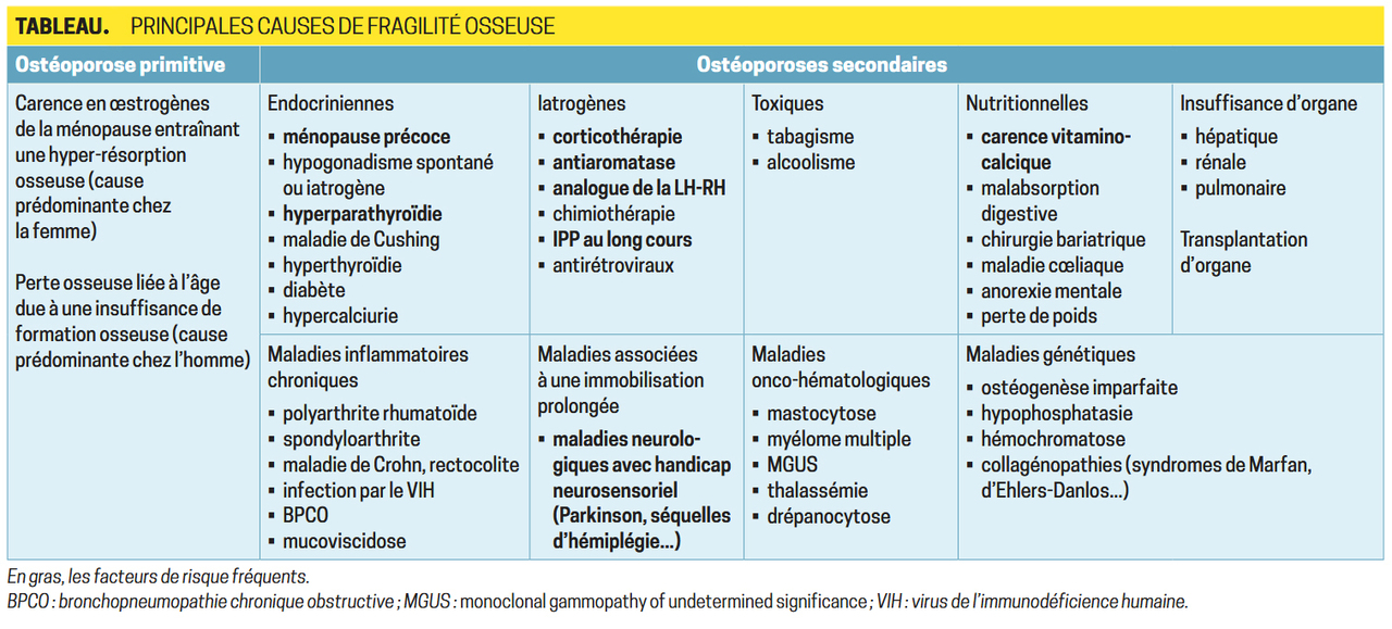 Quelles sont les causes de fragilité osseuse ? D'après : Bouvard B, Legrand E. Ostéoporose. Rev Prat Med Gen 2025;39(1100):381-91.