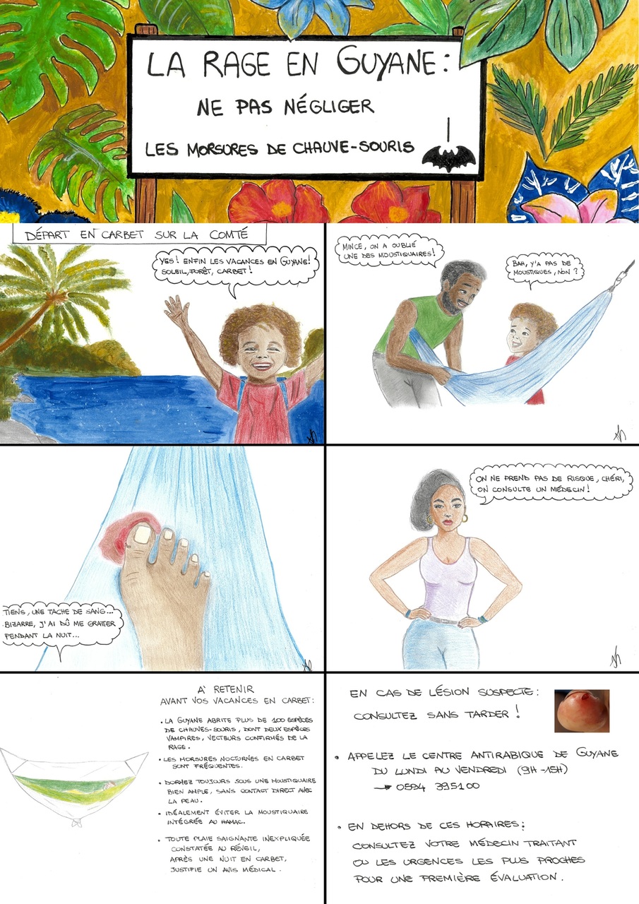 La Guyane française est une zone d’enzootie rabique. La transmission du virus se fait par morsure, griffure ou léchage sur peau ou muqueuse lésée par les mammifères terrestres (exceptés les petits rongeurs) et volants (chauves-souris).1,2