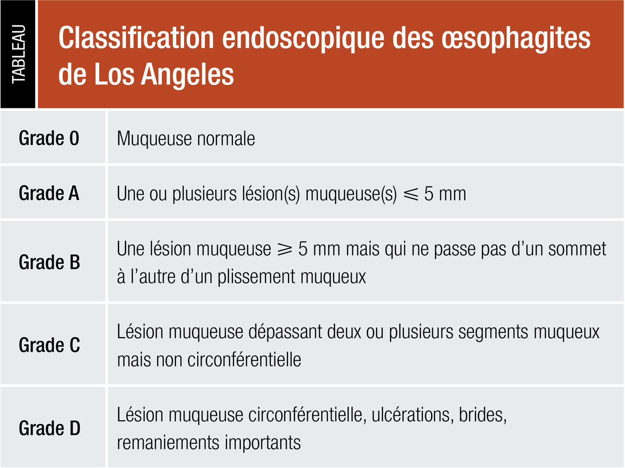 En présence d’une œsophagite ou d’une sténose peptique, le diagnostic positif de reflux gastro-œsophagien est affirmé, et la sévérité des lésions doit être classée selon la classification de Los Angeles