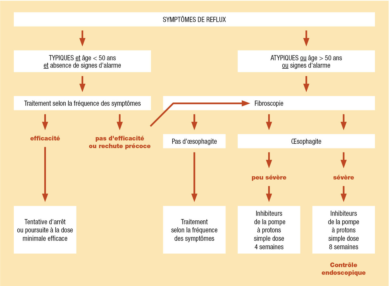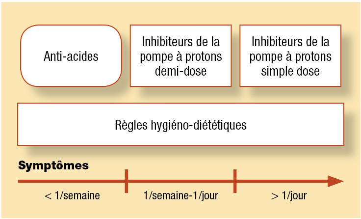 Si les symptômes sont fréquents (> 1 fois par semaine), mais typiques, et qu’il n’y a pas de signes d’alarme, il est recommandé d’introduire un traitement par inhibiteurs de la pompe à protons à demi-dose associé aux règles hygiéno-diététiques. Au bout de 15 jours, si les symptômes ne sont pas contrôlés, les inhibiteurs de la pompe à protons peuvent être donnés à simple dose. Si les symptômes sont pluriquotidiens et altèrent la qualité de vie du patient, ils peuvent être débutés d’emblée à simple dose. En cas d’efficacité, ils sont poursuivis 4 semaines.