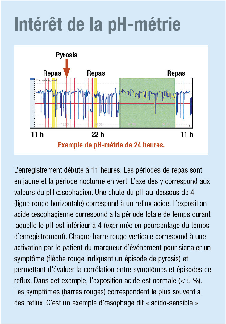 La pH-métrie établit le diagnostic positif du reflux gastro-œsophagien en détectant les épisodes de reflux, elle n’est donc pas nécessaire si les symptômes sont typiques ou s’il existe une œsophagite à la fibroscopie œso-gastro-duodénale. Elle est réalisée si les symptômes sont atypiques et la fibroscopie normale, si les symptômes résistent à un traitement bien conduit, ou en préopératoire si la fibroscopie était normale. Elle peut être filaire, réalisée grâce à une sonde placée dans la narine descendant jusqu’au bas œsophage, ou sans fil, avec une électrode unique placée dans le bas œsophage après repérage endoscopique. On mesure sur 24 heures, voire 48 heures pour la pH-métrie sans fil, les variations de pH dans le bas œsophage, transmises à un boîtier placé à la ceinture du patient et analysées informatiquement. Simultanément, le patient signale ses symptômes au niveau du boîtier, pour permettre d’analyser la concordance entre les symptômes ressentis et les épisodes de reflux. La pH-métrie sans fil est mieux tolérée, les enregistrements peuvent donc être plus longs, et le rendement diagnostique s’en trouve amélioré. Le diagnostic de reflux gastro-œsophagien est posé si l’œsophage est exposé à un pH < 4 plus de 5 % du temps ou si une association symptôme-reflux est mise en évidence.