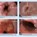 Un endobrachyœsophage peut être circonférentiel et/ou en languette, sous la forme d’une ligne Z irrégulière ou décalée vers le haut par rapport à la limite des plis gastriques et à la pince diaphragmatique, avec une muqueuse de type intestinale plane ou nodulaire. Les lésions sont décrites selon la classification de Prague, et les zones suspectes de métaplasie voire de dysplasie doivent être biopsiées.
