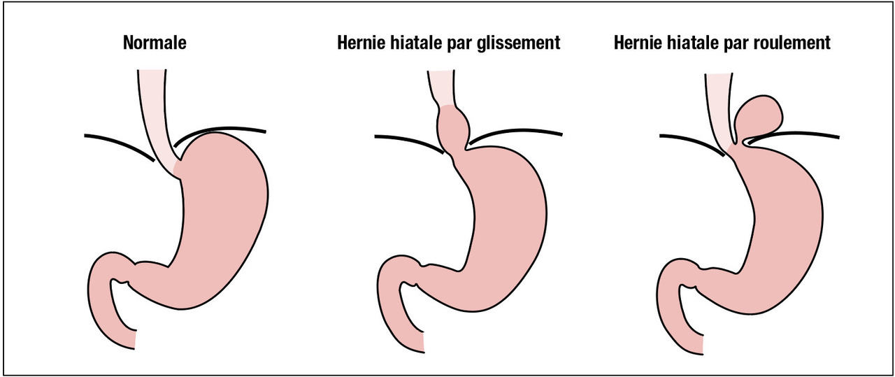 Il existe deux types de hernie hiatale : la hernie hiatale par glissement, la plus fréquente, est une migration axiale de la jonction œsogastrique dans le thorax, suivie par le fundus. C’est un phénomène fréquent, retrouvé chez environ 50 % des patients ayant un reflux gastro-œsophagien. Cependant, tous les sujets ayant une hernie hiatale ne souffrent pas de reflux gastro-œsophagien. Son rôle physiopathologique dans le reflux gastro-œsophagien est important, même s’il a longtemps été surestimé. Le diagnostic le plus fiable est fait à la manométrie œsophagienne, mais la hernie hiatale peut être également visualisée à la fibroscopie œso-gastro-duodénale ou au transit œso-gastro-duodénal. Hormis le reflux gastro-œsophagien, la principale complication de la hernie hiatale est l’ulcération liée aux frottements au niveau du collet herniaire. Le traitement est chirurgical, mais n’est indiqué qu’en cas de reflux gastro-œsophagien avec critères chirurgicaux. Il n’y a aucune indication chirurgicale en cas de hernie hiatale asymptomatique.
