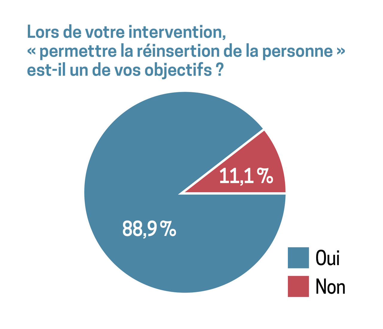 - 85 % des professionnels de santé ayant répondu travaillent en centres de rééducation, 4 % en centre de traitement des brûlés (CTB) et 1 % en centre de soins aigus (66,7 % en pédiatrie, 44,4 % en service adultes). Les trois professions les plus représentées étaient les ergothérapeutes (48,1 %), les kinésithérapeutes (25,9 %) et les médecins (14,8 %). Dans la question ouverte « Quels sont vos objectifs dans l’accompagnement du brûlé ? », quatre items ressortent : amélioration de la cicatrice, amélioration fonctionnelle, équipement, travail sur les activités de la vie quotidienne et autonomie. La notion de réinsertion psychosociale est évoquée deux fois sur 27 réponses. Cependant, à la question fermée « Lors de votre intervention, permettre la réinsertion de la personne est-il un de vos objectifs ? », 88,9 % des professionnels répondent par l’affirmative (fig. 2). Selon les réponses, les moyens utilisés sont la récupération esthétique et fonctionnelle, le travail multidisciplinaire, l’écoute et l’échange avec le patient et sa famille, le suivi psychologique, les jeux de rôle ou les visites à domicile, les liens avec l’extérieur (travail, école, association), l’éducation thérapeutique du patient, l’évaluation de la performance et l’engagement occupationnel.