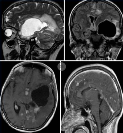 Cette femme de 44 ans avait un tableau d’hypertension intracrânienne et des troubles du comportement, un syndrome pyramidal droit, une paralysie faciale centrale droite, un syndrome confusionnel et un œdème papillaire ; pas de particularité pour le reste de l’examen, notamment pulmonaire. Le bilan biologique (test de sensibilité à la tuberculine, antigène carcinoembyonnaire, métabolisme calcique, cytologie du lavage bronchoalvéolaire) et la radiographie pulmonaire étaient normaux. La tomodensitométrie (TDM) cérébrale (fig. 1 ) montrait une lésion kystique temporale gauche exerçant un effet de masse sur la ligne médiane avec un œdème périlésionnel. Après injection il y avait une prise de contraste micronodulaire leptomeningée diffuse et de la corne occipitale du ventricule latéral gauche. L’imagerie par résonance magnétique (IRM) [fig. 2 ] montrait une volumineuse lésion kystique expansive temporale gauche, dont les parois ne se rehaussaient pas après injection du produit de contraste avec un hypersignal T2 périlésionnel ainsi qu’un engagement temporal. La résection chrirugicale et la corticothérapie permettaient une amélioration neurologique immédiate. L’histologie était en faveur d’un granulome épithéloide gigantocellulaire sans nécrose caséeuse.