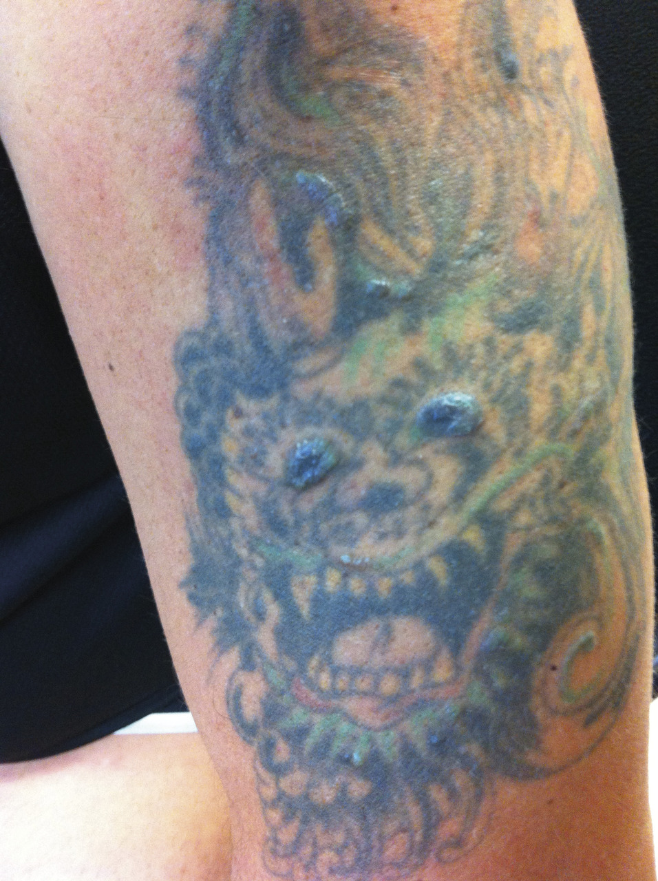 M. J., 51 ans, consulte car, depuis un « coup de soleil » une semaine auparavant, il a remarqué que les yeux du dragon de son tatouage ancien de l’épaule apparaissent en relief. Le reste de l’examen clinique est normal. La biopsie trouve une réaction granulomateuse épithélioïde et gigantocellulaire centrée sur du pigment, évocatrice de sarcoïdose. Le taux d’enzyme de conversion de l’angiotensine est normal, le scanner thoracique met en évidence des adénopathies médiastinales. La prise en charge a consisté en un traitement par hydroxychloroquine pendant deux ans avec une surveillance dermatologique, pneumologique et ophtalmologique. L’évolution a été favorable sans séquelles.