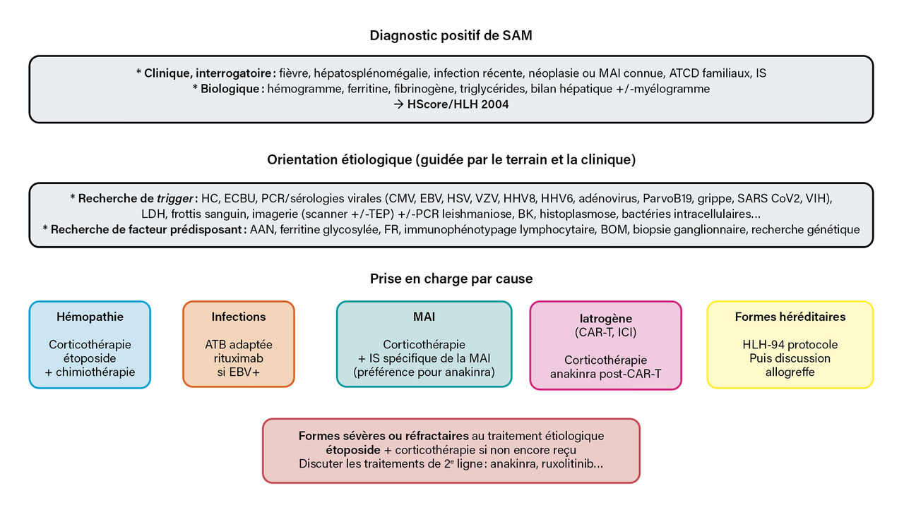 Le SAM est une réaction inflammatoire incontrôlée et potentiellement mortelle causée par une immunodéficience et/ou une pathologie néoplasique, infectieuse ou auto-immune. Le diagnostic précoce et le traitement rapide de tout facteur déclenchant et de l’hyperactivité du système immunitaire constituent la base de la prise en charge.
