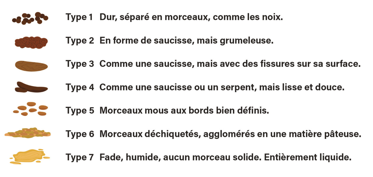 Le diagnostic repose sur l’interrogatoire et notamment sur l’association de douleurs abdominales chroniques et de troubles du transit. Les critères diagnostiques (critères de Rome IV, tableau et figure), utilisés surtout dans les études ont été actualisés en mai 2016.4 Le SII fait partie, dans la nouvelle classification de Rome, des « désordres des interactions de l’axe cerveau-intestin » (disorders of gut-brain interaction [DGBI]).5 Les symptômes doivent être présents depuis au moins six mois avec une fréquence minimale des douleurs abdominales (au moins un jour par semaine sur les trois derniers mois). Il existe différents sous-types de SII selon le type de trouble du transit défini en utilisant l’échelle de Bristol6 (figure) qui distingue des formes avec diarrhée prédominante (SII-D), avec constipation prédominante (SII-C), avec alternance de diarrhée et constipation (formes mixtes, SII-M) et des formes inclassées (absence de critères suffisants pour répondre aux critères des autres formes). L’examen clinique est en général normal. Parfois, cependant, il est possible de reproduire les douleurs par une palpation douce ou plus appuyée sur différentes zones de l’abdomen, constater une distension abdominale, un tympanisme ou palper une « corde colique ». Le retard diagnostique est fréquent et dépasse les trois ans dans une étude française de 2020.7