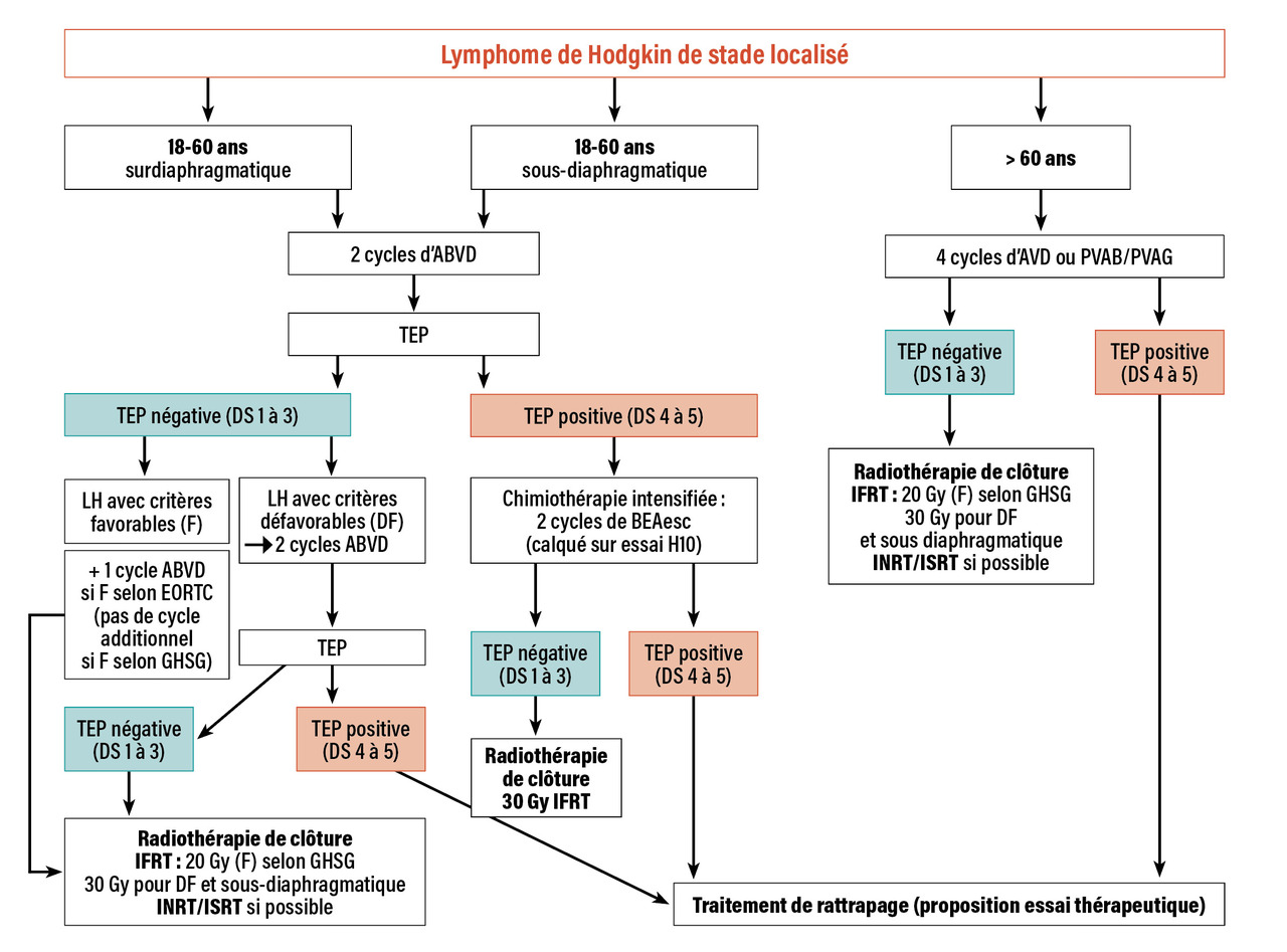 La prise en charge en première ligne du LH, désormais guidée par la TEP, ne cesse de s’améliorer pour tendre vers des stratégies adaptées à une stratification pronostique précise, et trouver peu à peu le meilleur compromis entre le contrôle tumoral et les effets indésirables à court et long termes. Des propositions d’algorithmes de prise en charge sont présentées dans les figures 1 et 2 . Au-delà des bénéfices de la TEP pour la prise en charge des patients, de nouvelles molécules (BV et anti-PD1) ont permis d’améliorer le contrôle de la maladie, notamment dans les situations d’échec. Leur place exacte en première ligne reste à définir de façon consensuelle. Enfin, de nouveaux outils, tels que le dosage de l’ADN tumoral circulant dans le plasma, pourraient permettre d’adapter les stratégies thérapeutiques de façon encore plus précise, tout en permettant de rechercher des mutations potentiellement actionnables pour les patients en réponse insuffisante.