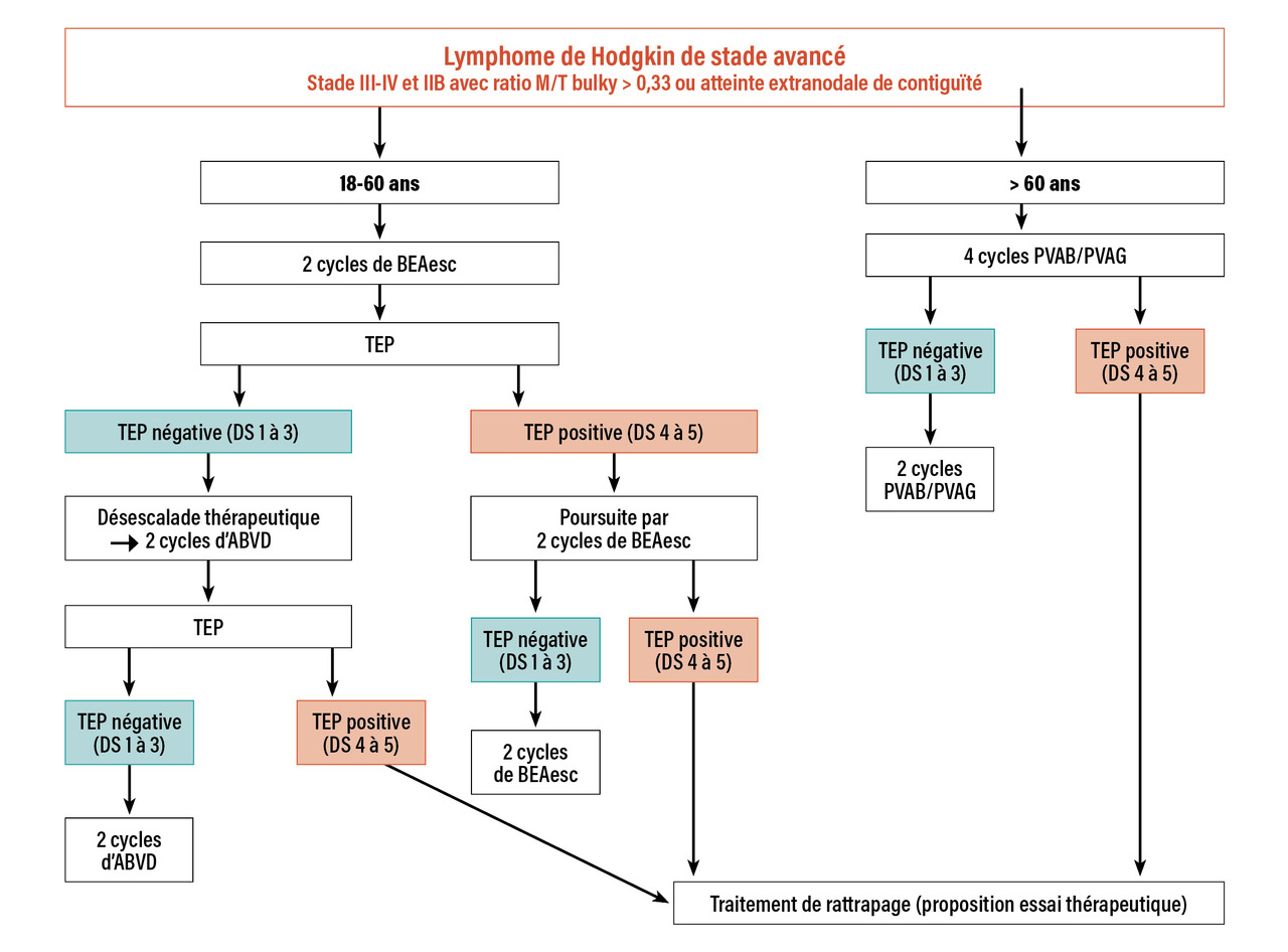 Sans qu’il soit possible de trancher définitivement entre les schémas thérapeutiques commençant par l’ABVD ou par le BEAesc, il est désormais incontournable de mettre en œuvre une stratégie de traitement guidée par la TEP. Avec les réserves qui s’imposent pour des comparaisons directes entre les études, la stratégie débutant par le BEAesc semble améliorer le contrôle tumoral non seulement chez les patients TEP2+ mais aussi chez les TEP2-. En comparant les différents types de stratégie de première ligne sur les plans médico-économique et coût-efficacité, la stratégie TEP-guidée de désescalade calquée sur AHL 2011 serait à privilégier.19
