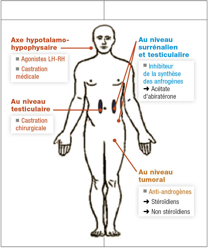 La production est majoritairement testiculaire. Les options sont donc la castration chirurgicale (pulpectomie). Les méthodes médicamenteuses utilisent les agonistes de la LH-RH (goséréline, leuproréline). Ils sont associés durant les premières semaines à un anti-androgène pour éviter la remontée initiale de la testostérone liée à l’action de la LH-RH (effet flare-up). L’efficacité est rapide, en quelques semaines, les effets secondaires dominés par les troubles de la libido et les bouffées de chaleur. L’acétate d’abiratérone est une nouvelle hormonothérapie, inhibant la synthèse des androgènes en inhibant le complexe CYP-17 testiculaire et surrénalien.