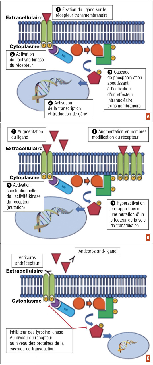 Schématiquement, la transduction du signal fait intervenir un ligand (facteur de croissance, par exemple), un récepteur et un effecteur secondaire