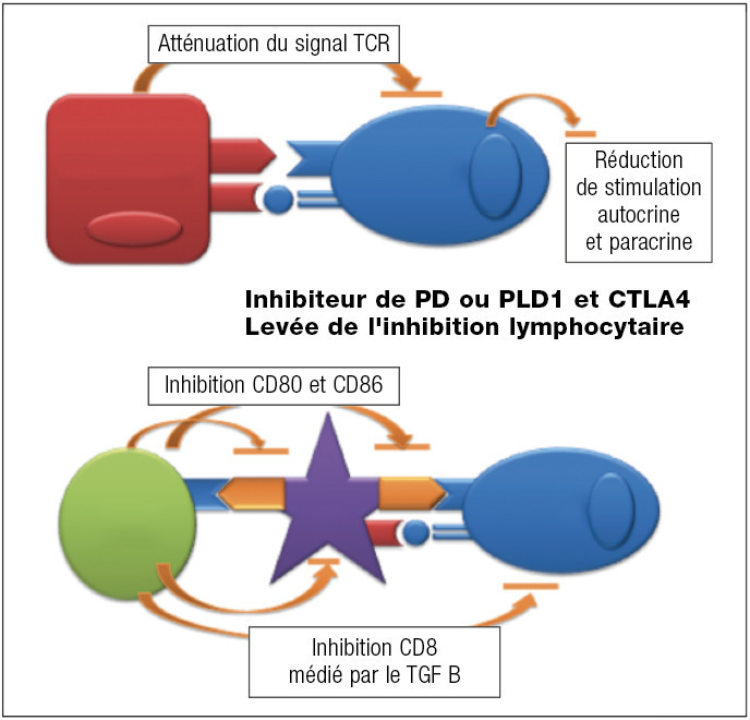 Les cellules tumorales ont pour caractéristique de pouvoir échapper au système immunitaire du patient, induisant une tolérance immune en particulier vis-à-vis des lymphocytes effecteurs. La levée des signaux inhibiteurs par des anticorps permet de réactiver l’immunité antitumorale et d’obtenir un contrôle du cancer. Les effets secondaires sont différents de ceux des cytotoxiques, en rapport avec une activation inadaptée du système immunitaire conduisant au développement de pathologies immunologiques (thyroïdite, hypophyse, colite inflammatoire, pneumopathie inflammatoire). Elles sont actuellement validées dans de nombreux organes (mélanomes, poumons) dans les stades métastatiques et en développement précoce.