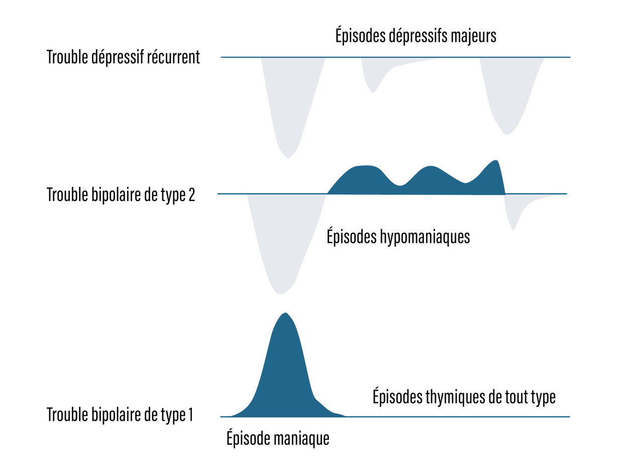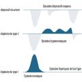 D’après le DSM- 5, le trouble bipolaire de type 1 correspond à la présence d’au moins un épisode maniaque ; le type 2 correspond à la présence d’au moins un épisode hypomaniaque (figure). On décrit également des virages maniaques ou hypomaniaques uniquement sous substances, notamment sous antidépresseur (parfois appelé type 3). Le spectre bipolaire inclut aussi la cyclothymie (alternance d’épisodes dépressifs modérés et d’hypomanie) et le trouble bipolaire non classé ailleurs (concept d’hypomanie brève, notamment).
