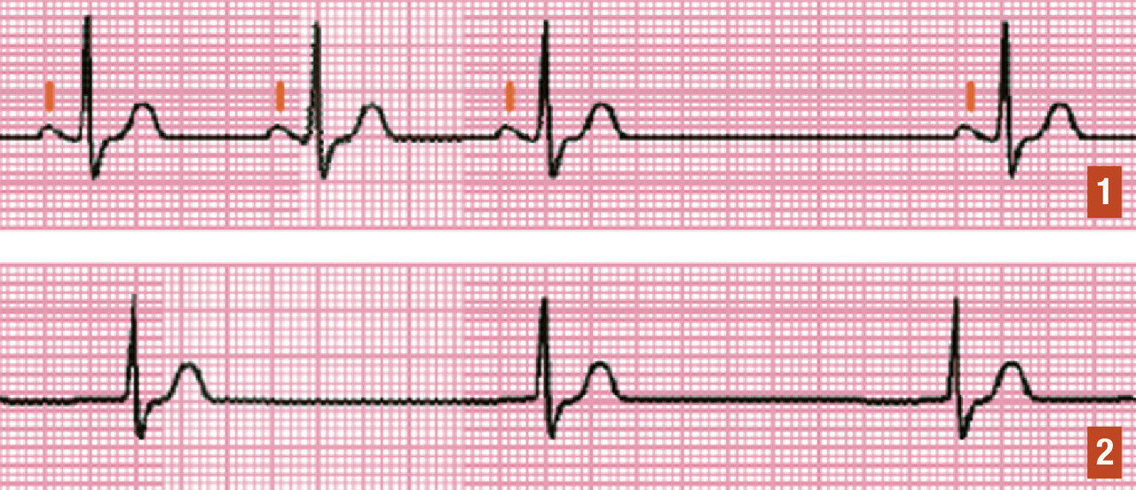. BAV 2 en 2/1 : chaque onde P donnant un QRS est suivie d’une onde P bloquée. Il peut alors s’agir d’un BAV 2 Mobitz 1 (avec l’intervalle PR qui s’est tellement allongé d’un coup que la 2e onde P se retrouve d’emblée bloquée) ou d’un BAV 2 Mobitz 2 avec une onde P bloquée de manière intermittente une fois sur 2.